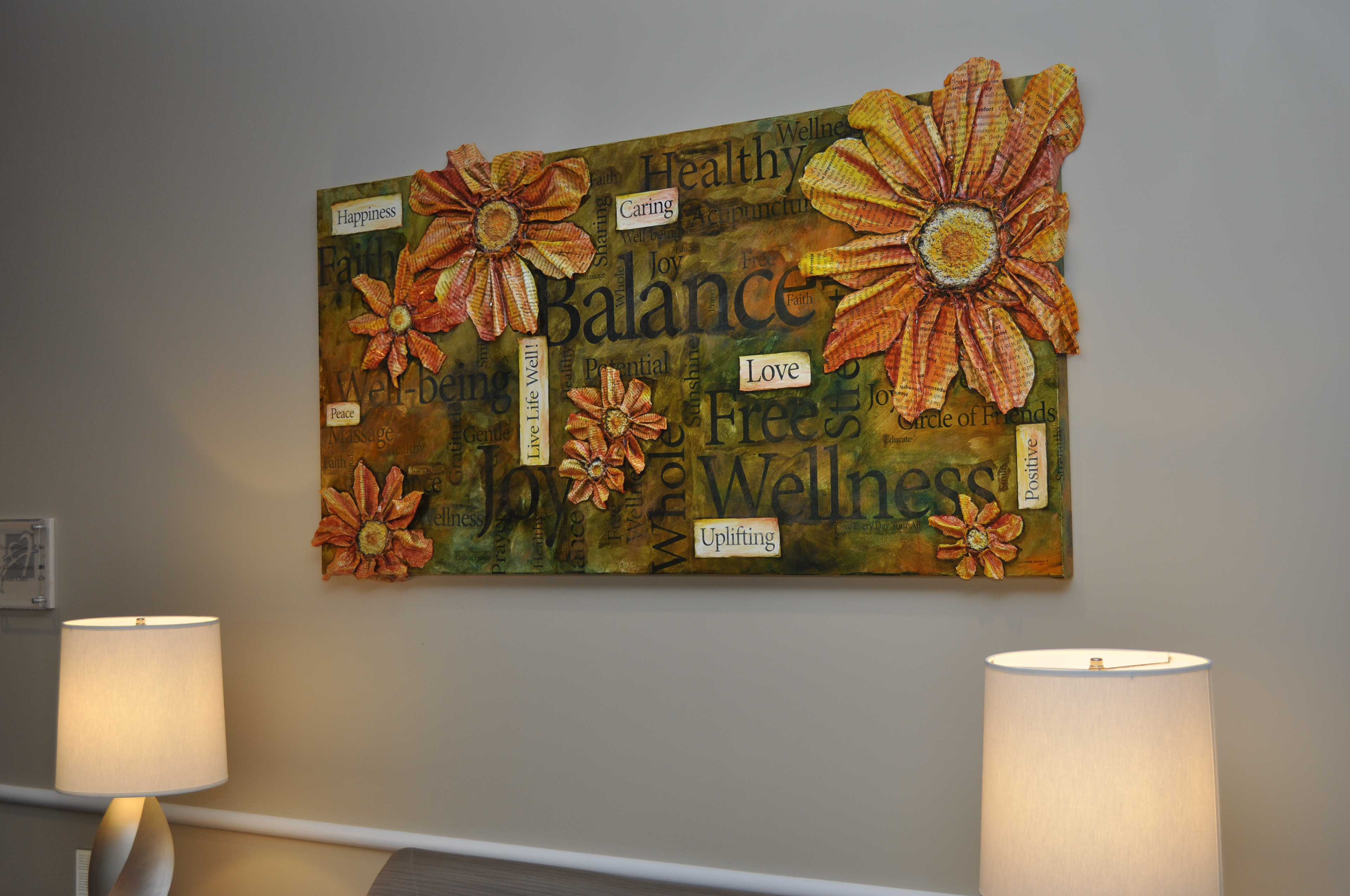 60 x 24 Wellness Meadow, SOLD, with 3 hidden Believe words, flowers with mustard seed centers and inspiring word petals that lift off the canvas to adorn this centerpiece at the Tevis Center for Wellness.