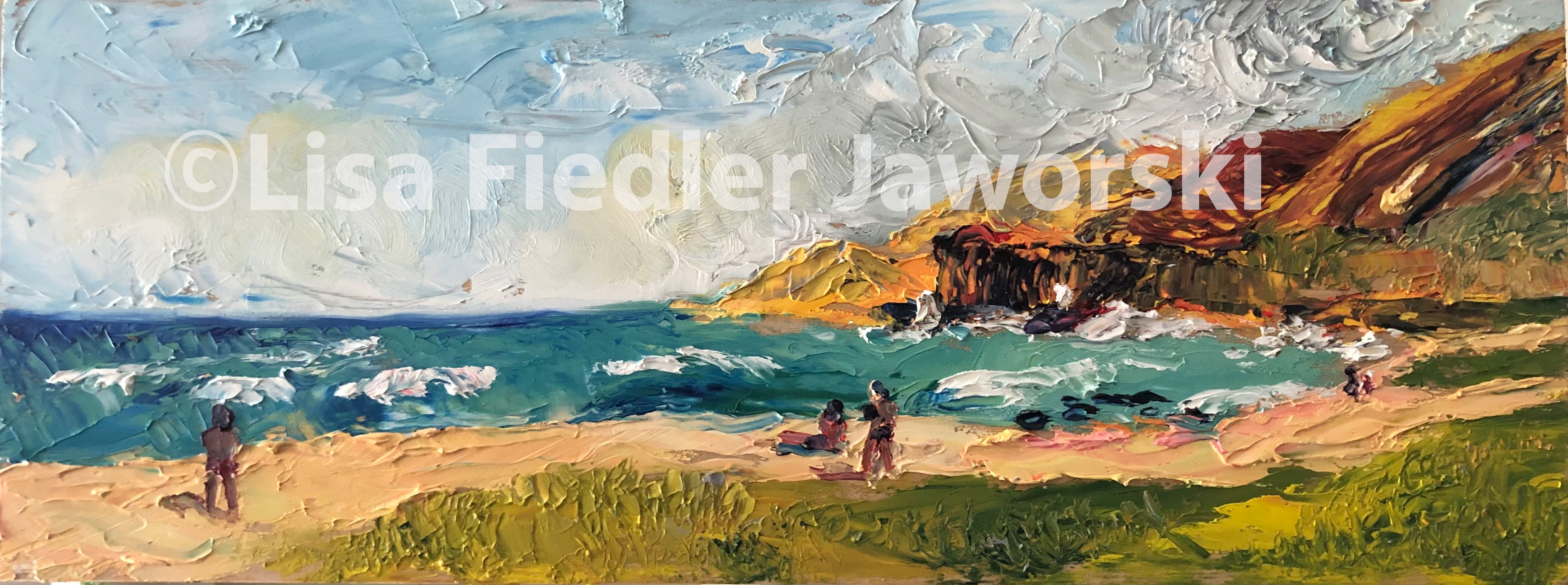 (SOLD) available by commission only: 14" x 7" Love at Pounder's Beach, oil on canvas