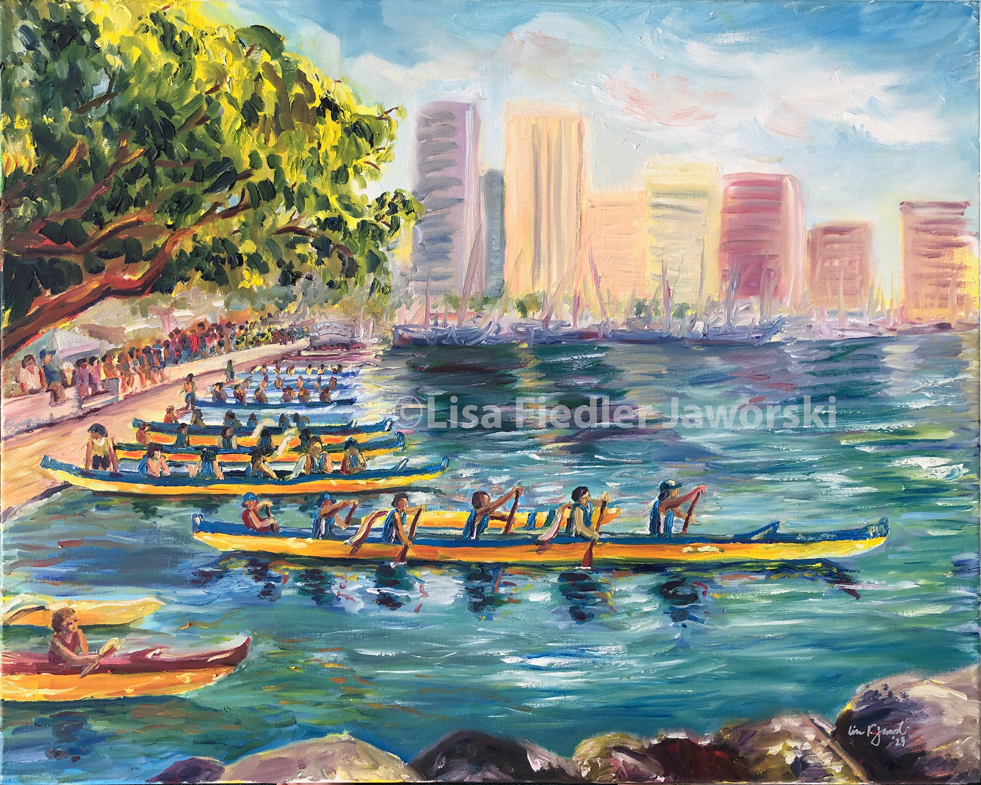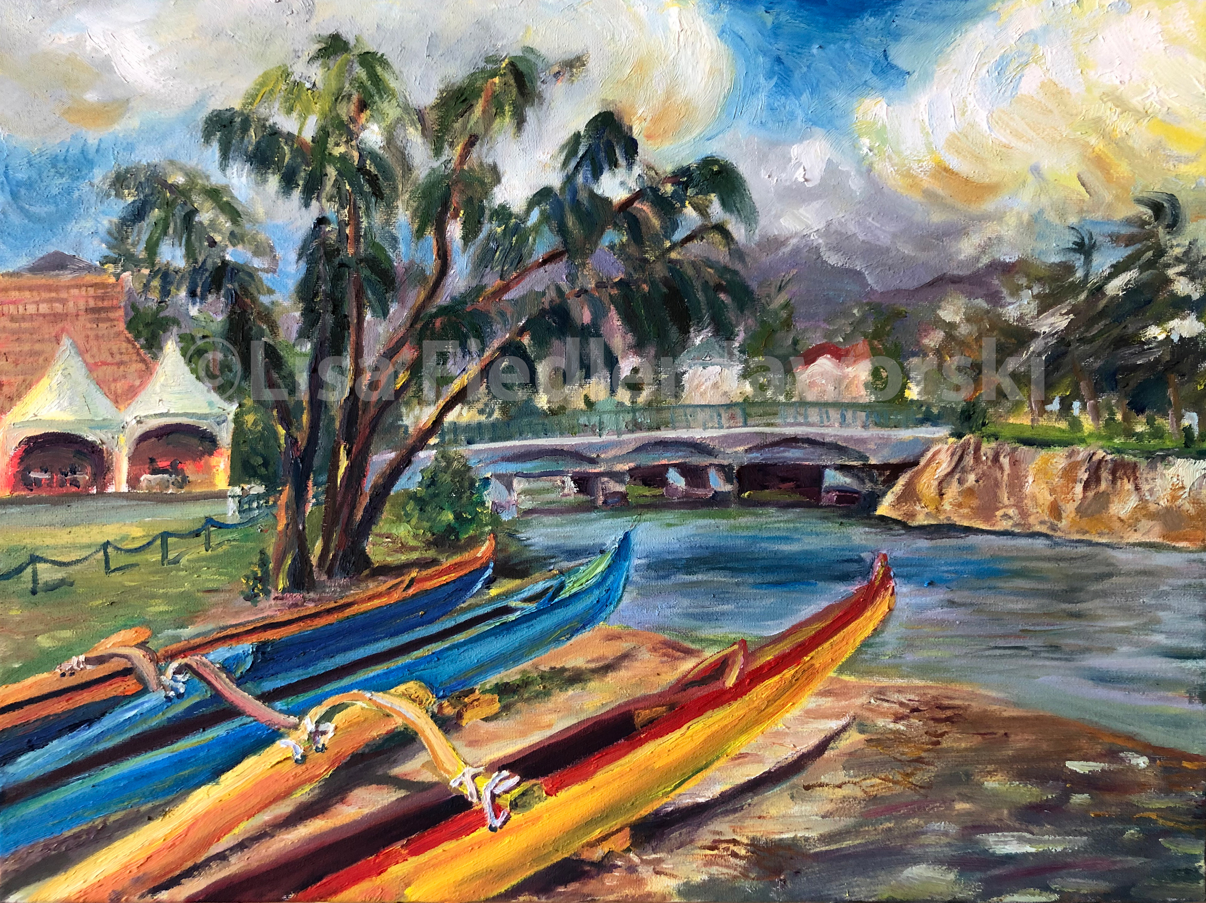 7 x 14 oil on canvas, Kawaipuna Voyaging Canoe, Painted on location at Ko"Olina's Lagoon 1
