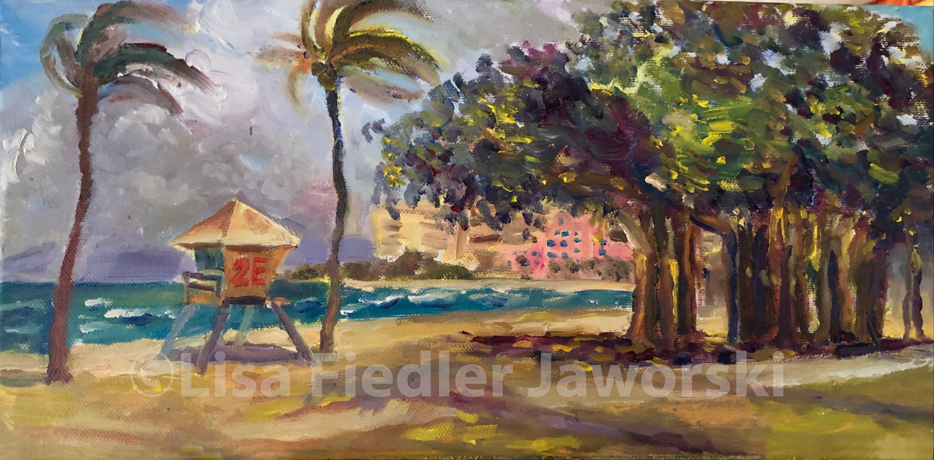 SOLD—(available by commission only) Stormy day at Queens Beach, Waikiki 14 x 7 oil on canvas